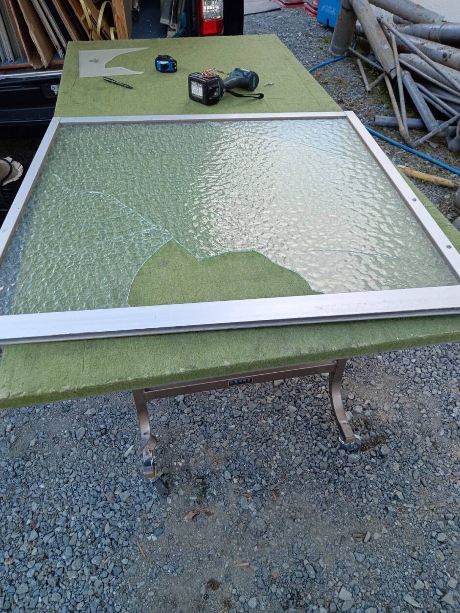 割れたガラスは昭和型板ガラスのロックラルガラスです。ロックラルガラスは昭和30年製造のガラスですが、現在は廃盤となっております。