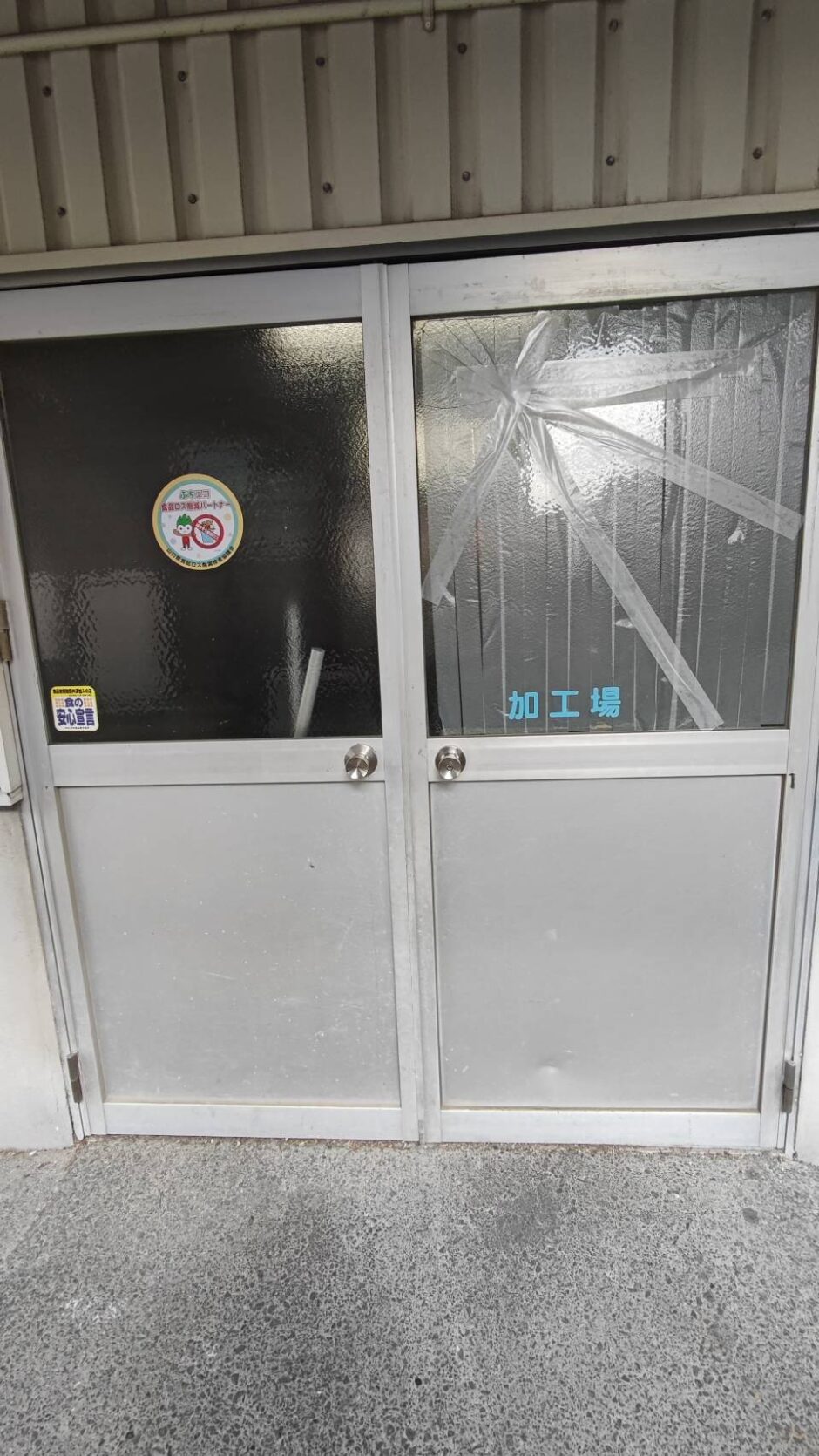 先日、防府市三田尻にてみやび商店様の店舗ドアガラス交換修理を行いました。