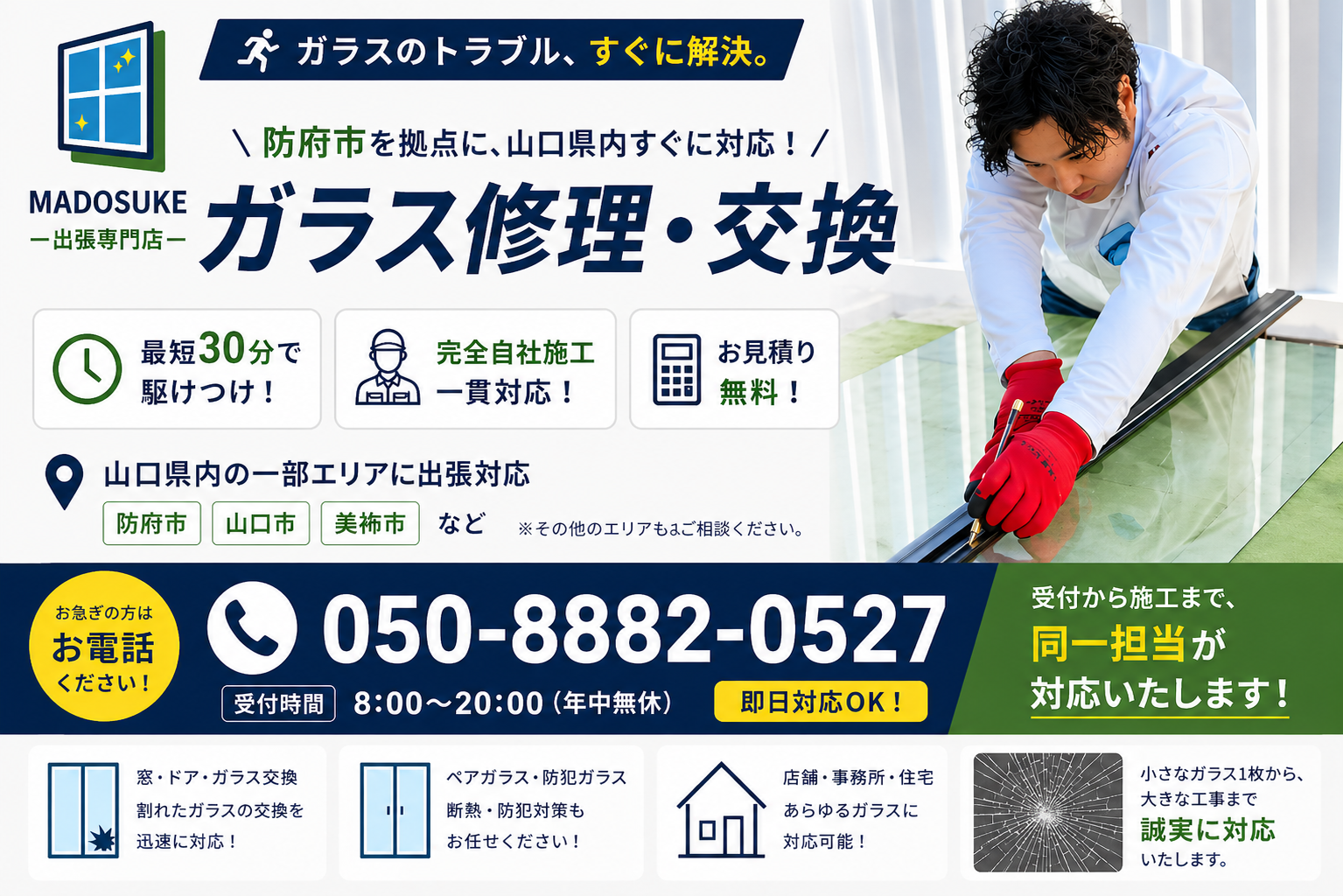 MADOSUKEガラス店 防府店では、防府市全域の窓ガラス交換・ガラス修理に出張対応しております。